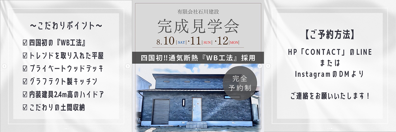 住む人の生活(人生)がより快適になるような価値ある家づくりを心掛けております。当社は大工仕事を得意としております。木材の持つ特性を生かした通気制御「WB工法」取り扱い工務店(四国エリア)として、施工を請け賜わっております。新築・リフォームは、当社(イシケン)にご相談下さい。