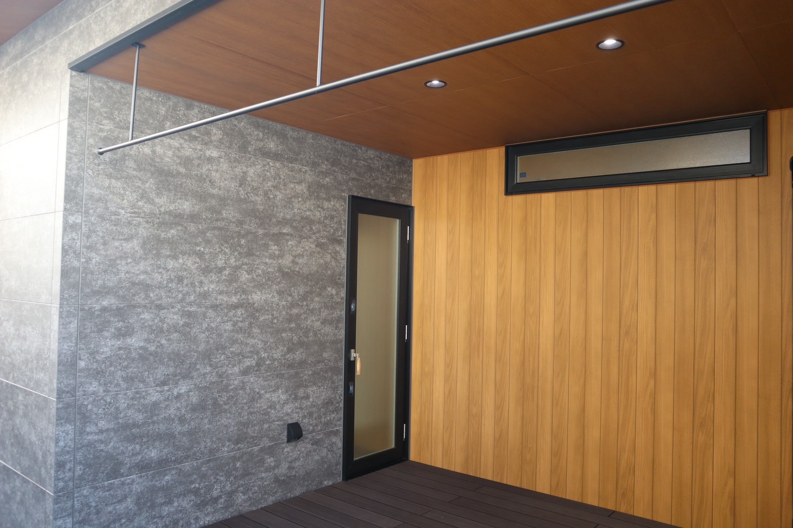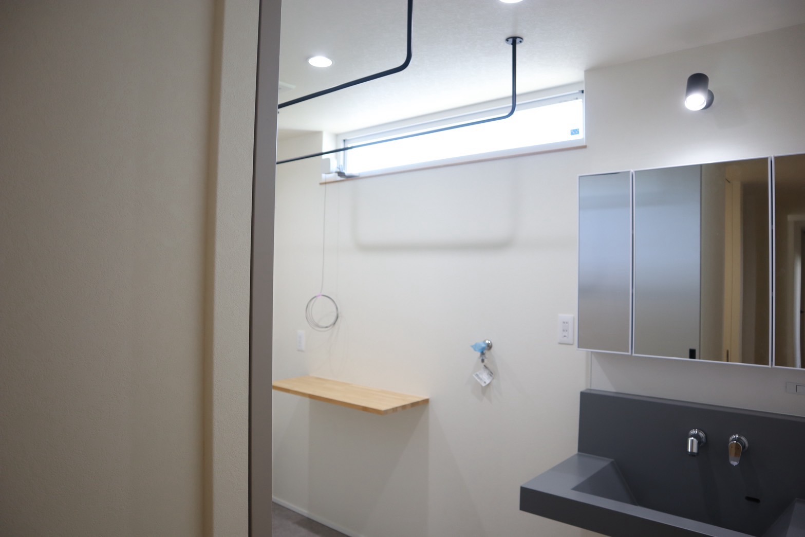洗濯物を干す広い軒下スペースをとりました。屋内からそのまま出られて便利です。