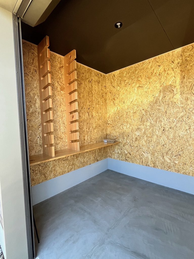 玄関横に外靴のまま入れる土間収納を設けました。趣味の道具を飾れる「手作り木棚」(作る様子はYouTubeにて配信中)を設置。木工作業を得意とする弊社の職人らしさを出せました。