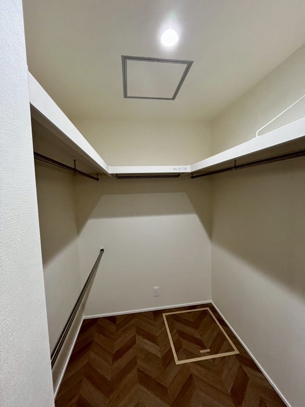 靴収納。洗面所の大きな棚。格納式の階段をつけたロフト収納は、WB工法で夏でも換気されており、まさに「呼吸する家」だから安心な構造となっております。